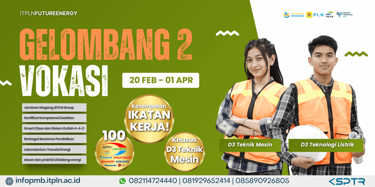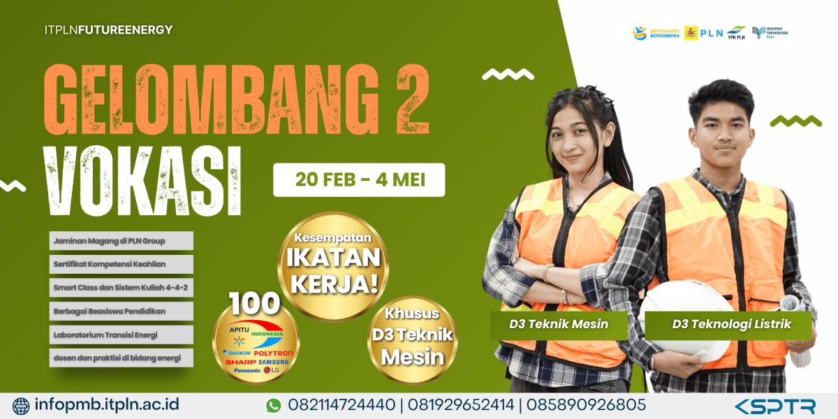 Institut Teknologi PLN (ITPLN) kini resmi membuka Penerimaan Mahasiswa Baru Vokasi (D3) Gelombang 2 Tahun Akademik 2026. Inilah kesempatan terbaik bagi siswa yang ingin menyiapkan masa depan di bidang energi, teknologi, dan infrastruktur bersama kampus yang fokus mendukung transisi energi Indonesia.