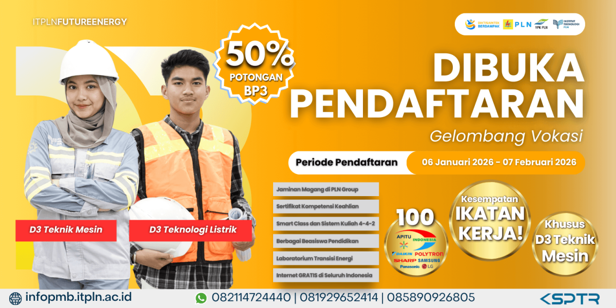 Institut Teknologi PLN (ITPLN) kini resmi membuka Penerimaan Mahasiswa Baru Vokasi (D3) Gelombang 1 Tahun Akademik 2026. Inilah kesempatan terbaik bagi siswa yang ingin menyiapkan masa depan di bidang energi, teknologi, dan infrastruktur bersama kampus yang fokus mendukung transisi energi Indonesia.